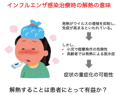インフルエンザウイルスに感染すると、白血球などから放出されるインターフェロンなどの発熱物質によって発熱が促される。インターフェロンにはインフルエンザウイルスの増殖を抑制する効果があり、免疫反応を活性化する役割もある。一方で、高熱が長く続くと、小児では「けいれん」の原因になり、高齢者では、脱水などのために症状が重症化することが指摘されていた。このため臨床の現場では、インフルエンザ患者の症状を改善し、重症化を防ぐ目的で解熱剤が使用されている。