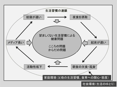 さらに、子どものメディア利用時間が長くなるほど、 朝食を欠食し、野菜をあまり食べず、1日2回以上間食するなど、望ましくない食習慣が増える傾向にあった。年齢や性別等の他の要因を考慮した統計分析の結果、メディアの利用時間が「1時間未満」の子どもと比較した場合の、「2時間以上」の子どもの望ましくない習慣に対するオッズ比は、「朝食を欠食する」で2.75(p<0.05)、「野菜を食べない」で2.68(p<0.05)、「1日2回以上間食をする」で4.16(p<0.05)だった。 今回の調査により、子どもの望ましい食習慣づくりには、社会環境の要素、家庭環境の要素、子ども自身の生活習慣の要素の3つの要素があることがわかった。要素の中には、社会環境のような自分自身の力だけでは見直しが難しいものと、親の生活習慣や子どもの生活習慣のように見直しが可能なものがある。子どもの望ましい生活習慣づくりには、子どもに対する健康教育だけではなく、親に対する健康教育も必要であり、地域社会や学校の協力の下に子どもの健康習慣づくりを進める必要があるといえると、研究グループは述べている。