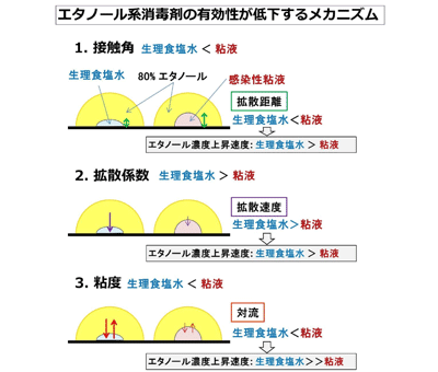 季節性インフルエンザAウイルス(IAV)による例年のアウトブレイクは、多大な人的および経済的被害をもたらしており、伝播の予防は感染管理にとって重要な問題だ。感染性体液中に含まれる有機物による消毒薬の効果減弱については、すでに広く知られ、消毒薬効果評価基準にも考慮されている。喀痰などの感染性粘液中の病原体に対するエタノールベース消毒剤(EBD)など消毒薬の効果について評価・議論した論文はいくつか見受けられるが、有機物以外の消毒薬の効果減弱因子は同定されておらず、少なくとも現行の手指衛生・接触感染予防では病原体の殺菌不活化に不十分であることは報告されていなかった。