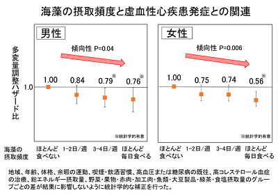 食事アンケート調査の中で、海藻の摂取頻度に関する回答から、対象者を「ほとんど食べない」、「週に1~2日」、「週に3~4日」、「ほとんど毎日食べる」の4つのグループに分け、その後の脳卒中および虚血性心疾患発症との関連を男女別に検討した。約20年間の追跡期間中に、4,777人が脳卒中を発症し、1,204人が虚血性心疾患を発症した。海藻を「ほとんど食べない」グループと比較して、海藻を「ほとんど毎日食べる」グループの虚血性心疾患の発症リスクは、男性24%、女性44%低いことが明らかになった。しかし、脳卒中(脳梗塞、脳出血およびクモ膜下出血)については、海藻摂取との関連は見られなかった。