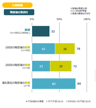 調査の結果、心筋梗塞を発症した患者の70~80%が、発症により不安を抱いたが、医師が実際に不安を訴えたとレポートした患者の割合は約30%だった。不安の内容として最も多かったのは「また発症するのではないか」で、心筋梗塞発症の回数が多い患者では、「死ぬ可能性があるのではないか」という不安が高くなる傾向だった。