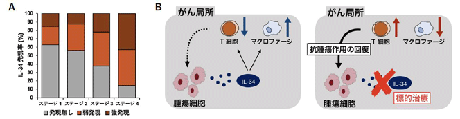 まず、北海道大学大学院医学研究院産婦人科学教室(婦人科腫瘍学)、聖マリアンナ医科大学産婦人科学教室、文部科学省科学研究費新学術領域研究「コホート・生体試料支援プラットフォーム(CoBiA)」から提供を受けた臨床検体を用い、これらの検体におけるIL-34の発現と検体情報から、卵巣がんの病巣におけるIL-34とがんの悪性度及び患者の予後との関連性を検証。その結果、ステージが3、4にまで達している患者の検体におけるIL-34の発現率は、ステージが1、2の患者よりも高いと判明。また、外科的手術及び抗がん剤治療を行った後に再発した検体では、原発巣と比べIL-34の発現が高いレベルで検出された。