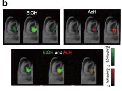実証実験として汗腺密度や表皮層数の異なる手掌、手指、手背、足裏、耳を対象部位として一定量のアルコール飲料を摂取後の健常被験者より放出される皮膚ガス中のエタノール、そして代謝産物であるアセトアルデヒドの濃度分布をリアルタイムに画像化し、アルコール代謝の非侵襲モニタリングに成功。探嗅カメラがエタノール(またはアセトアルデヒド)を検出する仕組みには、補酵素ニコチンアミドアデニンジヌクレオチド(NAD)依存型アルコール脱水素酵素(ADH)の触媒反応を用いたバイオ蛍光法を用いた。これにより、従来の手法では観察することの困難であった「身体部位により異なる汗腺分布および表皮層数」と「皮膚から放出されるVOCs」の関係の考察が可能になった。特に、薄い表皮下に毛細血管が密に分布し、かつ汗腺の少ない耳周辺領域が経皮VOCs計測に適する部位であることも判明した。これは、今後の「皮膚での血液ガス計測」につながる大きな成果だ。