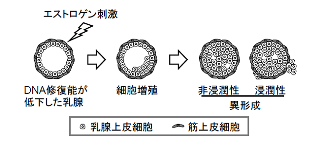 エストロゲン+DNA 修復能の低下<Mycの高発現<乳腺上皮細胞の増殖<異形成