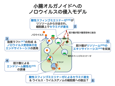 また、胆汁酸を細胞培養液に加えると、エンドサイトーシスの促進、エンドソーム酸性化の誘導、腸内腔側細胞膜のセラミドレベルの増加など、複数の細胞活動の変化を引き起こすことも明らかにした。さらに、ノロウイルスがこれら複数の細胞活動の変化を巧みに利用して細胞に侵入していくことを示した。