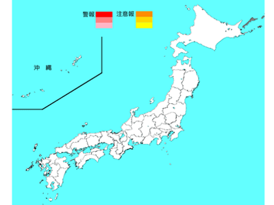 警報・注意報は、地域を管轄する保健所単位で発生する仕組みになっている。全国の保健所地域で、警報レベル、注意報レベルを超えている地域はなかった。
