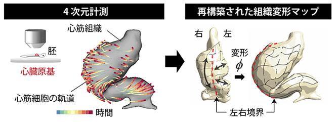 近年の顕微鏡技術やデータ解析技術などの進歩は、こうした過去に提案されてきた仮説モデルのどちらが正しいのかという問題に対する、客観的なアプローチを可能にしつつある。特に、発生初期の臓器は数千個の細胞がもととなって形を作っており、そこで起きている細胞の振る舞いを1細胞の解像度で計測・解析することが可能となった。心臓の発生を高解像度で4次元(空間3次元+時間1次元)観察することは、これまで困難だった。そこで研究グループは今回、心臓のライブイメージングと、先行研究で開発した細胞軌道情報から臓器形態の変形過程を再構築する数理的手法注を用いて、心臓の初期の形ができるCルーピングを組織レベルと細胞レベルの2つのスケールから明らかにすることを目標とした。