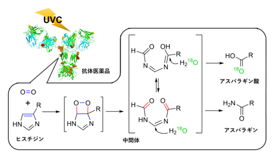 今回研究グループは、抗体医薬品にUVCを照射し、質量分析法と酸素の安定同位体である18O水を用いた実験により、ヒスチジンが中間体を経てアスパラギンおよびアスパラギン酸に変換されるメカニズムを解明した。
