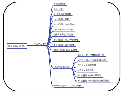 今回、日本感染症学会の了解を得て同学会ウェブサイトに掲載されている症例報告の中から、著者の許諾を取れた約70症例の報告を構造化して整理し、開発中のアルゴリズムを用いて検索エンジンを作成。症例の文脈をたどり、生じたイベントの時系列と、医学用語の関係を図示することで、COVID-19症例の可視化と、簡単な分析が可能となった。