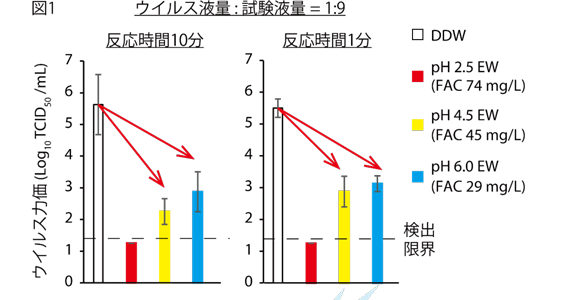 実験の結果、pH2.5EW(FAC 74mg/L)は1分の反応時間でウイルスを検出限界以下まで不活化した。一方、pH4.5(FAC 45mg/L)、pH6.0(FAC 29mg/L)では99%以上のウイルスが不活化されたが、検出限界以下には届かず感染性ウイルスが残存していたという。また、10分の反応時間においてもpH4.5(FAC 45mg/L)、pH6.0(FAC 29mg/L)によるウイルス不活化の程度は1分と大きく変わらず、ウイルスは検出限界以下とならなかった。