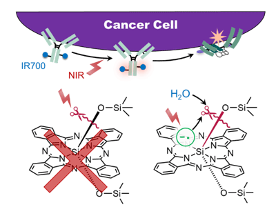 光免疫療法は、がん細胞以外に対してほとんど毒性を示さず副作用の極めて小さい、新しいがん治療法。さらに、がん免疫を合理的に活性化させる効果も発見されており、転移したがんへも有効であるなど、今後のがん治療を大きく変える可能性がある治療法として注目されている。光免疫療法では、IR700という水溶性のケイ素フタロシアニン化合物を結合させた抗体(抗体-IR700複合体)をがん細胞に結合させる。抗体-IR700複合体を投与した後、近赤外光を照射すると、IR700の水溶性の軸配位子が外されて薬剤が凝集することで、薬剤が結合したがん細胞のみを殺すことができる。しかし、近赤外線がどのように薬剤に作用して水溶性軸配位子の切断が起こるのか、また、この反応のスイッチは近赤外線でなくてはいけないのかは未解明だった。