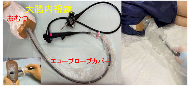 大腸内視鏡では、おむつパンツと腹部超音波用のプローブカバーを利用