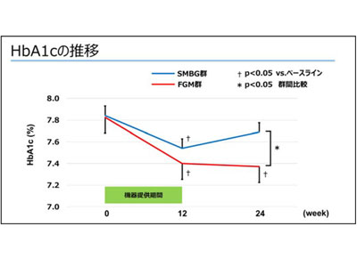 一定期間(12週間)のFGM(FreeStyleリブレ(R)、アボットジャパン合同会社)またはSMBGによる測定機会を提供した結果、12週間後のHbA1c変化量はFGM群(-0.43%)、SMBG群(-0.30%)となり、共に改善を認めた。24週間後のHbA1c変化量はFGM群(-0.46%)がSMBG群(-0.17%)と比較し有意な改善を認めたという(P=0.022)。糖尿病治療満足度質問票(DTSQ)のスコアにおいても、FGM群がSMBG群と比較し有意な上昇を認め、FGM群でより治療満足度が高かったことがわかった。