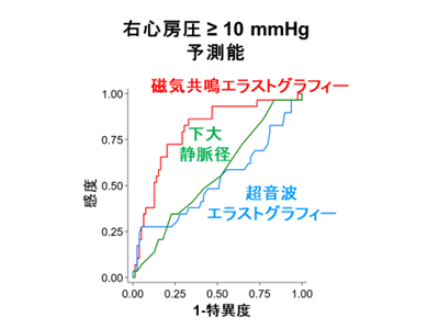 研究では、磁気共鳴エラストグラフィーで測定した肝硬度から推定された右心房圧と右心カテーテル検査で測定した右心房圧の相関解析を実施。さらに、磁気共鳴エラストグラフィーで測定した肝硬度、超音波エラストグラフィーで測定した肝硬度、心エコーで測定した下大静脈径に関し、右心房圧高値(いわゆる高度うっ血)の予測能を比較検討した。