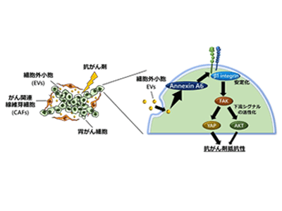 胃がんは日本において2番目に多いがん。特に進行した胃がんにおいては抗がん剤などのさまざまな薬剤が用いられているが、十分な病状の改善は得られていない。がん細胞の周りはがん微小環境とよばれるさまざまな細胞によって構成されている。その構成細胞の一つであるCAFsは、さまざまな因子を分泌することでがんの悪性化を強めることが知られている。同研究では、抗がん剤治療への抵抗性に関わるCAFs由来の分子を同定し、新規創薬への可能性を見出した。