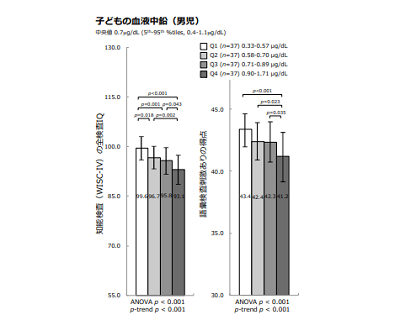 その結果、子どもの血液中の鉛濃度の中央値は0.7µG/DL、臍帯血中の鉛濃度の中央値は0.8µG/DLであり、日本人の血中鉛濃度は海外と比較すると低いことがわかった。これらの鉛と、12歳児の知能指数と語彙検査の得点との関連性を調べたところ、男児において、血液中の鉛の濃度が高くなるほど、知能指数が低くなることが示された。同様に、語彙検査の得点についても、鉛の濃度が高くなるほど男児の得点が低くなった。臍帯血中の鉛濃度については、知能検査の得点には影響は見られなかったが、男児の語彙検査の得点が低くなることが示された。この影響は女児では観察されなかった。