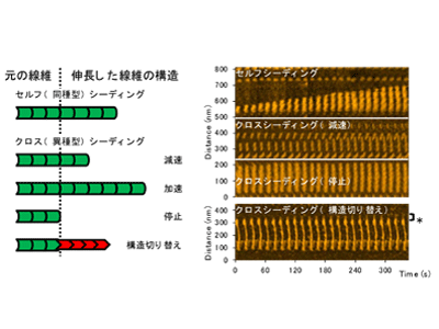 その結果、線維調製条件と同じ単量体を取り込ませたときと比べて、異種の単量体を取り込む線維伸長では、元の線維と同じ構造で伸長するものの、伸長速度が遅くなったり、早くなったり、あるいは全く伸長しなかったりすることがわかった。