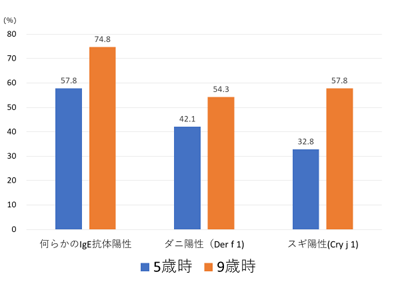 5歳から9歳で鼻炎が3倍、9歳でIgE抗体陽性は75%