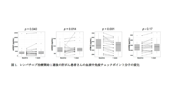 研究グループは、血管新生阻害剤レンバチニブまたはTACEで治療を受けた肝がん患者の血液で、PD-1、CTLA-4をはじめ16種類の可溶性免疫チェックポイント分子の濃度を測定した。その結果、レンバチニブで治療を行った患者では、1週間後に早くもsCD27が有意に低下、sCD40、sTIM-3が有意に上昇していることが判明。また、各免疫チェックポイント分子の変化に関する相関を解析したところ、sCTLA-4とsCD86/sCD80、sPD-1とsPD-L1など、受容体とリガンドの関係にある分子同士で相関がみられた。これらの結果は、レンバチニブが、がん微小環境の免疫状態に影響している可能性を示している。