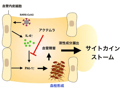 COVID-19患者のPAI-1レベルは、細菌性敗血症または重症熱傷の患者に匹敵する高さだった。このことが、肺をはじめとする多くの臓器で血栓を作らせ、血管から液性成分を漏出させ、炎症の重症化につながる。この事実は実験室系(In vitro)で血管内皮細胞をIL-6で刺激するとPAI-1が誘導されることで確認された。また、この現象はIL-6の働きをブロックする抗体医薬品トシリズマブ(製品名:アクテムラ(R))により抑えられた。今回の成果から、研究グループは、「新型コロナウイルス感染においてはIL-6が上昇する早期にアクテムラによってPAI-1の産生を抑えることが有効な治療になると予測される」と、述べている。