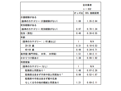 解析対象者836人(65歳以上:43.5%、男性割合:55.6%)のうち、人生の最終段階の医療に関して話し合ったことがあるのは346人(41.4%)だった。「人生の最終段階の医療に関して話し合いをしたことがある」との回答と正の関連が認められた要因は、大切な人の介護経験(オッズ比:1.88,95%信頼区間:1.35-2.64)だった。一方、大切な人との死別経験は関連が認められなかった。