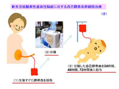 研究グループが取り組んでいる「自己さい帯血幹細胞治療」は、脳障害の回復を目的に、HIEの新生児に対し、自分のさい帯血から採取した幹細胞を出生後24時間ごとに3日間かけて点滴投与する治療法。自身のさい帯血を用いるため、拒絶反応を防ぐことも可能だ。