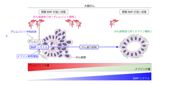 これらの結果から、今まで明らかでなかった「がん促進性CAF」および「がん抑制性CAF」は、それぞれグレムリン1およびメフリンにより規定され、CAFの機能的な多様性の本態はBMP発現量の違いによるものである可能性が示唆された。