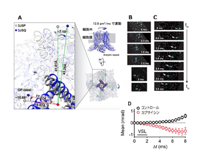 得られたデータが極めて小さい運動であったため、実測時間毎に層別して解析し(ライフタイムフィルタリング法)、結晶構造を用いた理論計算により構造変化の詳細を推定することで、詳細な運動情報を得ることにも成功した。さらに、カプサイシンとは反応しない変異体タンパク質を使った実験からは、阻害剤を加えた時と同様のチャネルを閉める左回り回転運動が検出されるなど、リアルタイム計測においてTRPチャネルのダイナミックな動きを多面的に示すことができたという。