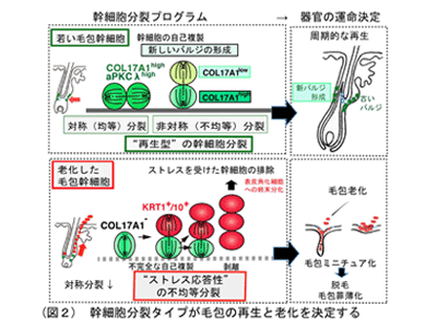 研究グループはこれまでに、ヘミデスモソーム構成因子であるXVII型コラーゲンを発現する毛包幹細胞が、毛包の再生に必須であることを明らかにしていた。また、加齢に伴うDNA損傷や放射線などの環境ストレスに応じて、XVII型コラーゲンの分解を引き起こすことで、毛包幹細胞が自己複製を行ったり、毛を生やす細胞を産生したりする代わりに、表皮角化細胞を生み出しフケ・垢として脱落させることにより、段階的に毛包のミニチュア化が進み、これによって薄毛や脱毛が引き起こされることを明らかにしてきた。しかし、器官の再生と老化を司る幹細胞分裂タイプの存在や、その分子基盤については全くわかっていなかった。