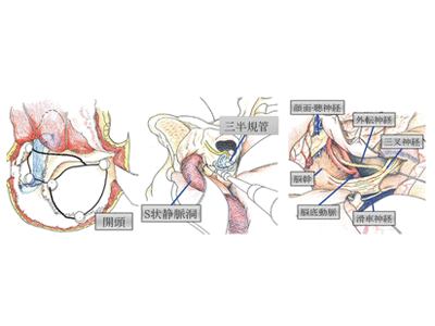 手術は1977年に同教室から論文発表した経錐体法を改良した方法(最小合併経錐体到達法)で行った。まず、頭蓋底外科の術後の合併症である脳脊髄液漏を予防するため、胸鎖乳突筋弁(耳の後ろにある筋肉)を剥離して筋膜弁を作成し、側頭後頭下開頭を行なった後に、S状静脈洞(耳の後ろを走行する太い脳静脈)を露出させた。錐体骨の切除は最小限とし、錐体骨の辺縁に沿って骨を削除。そして、天幕(大脳と小脳を分ける膜)を切開した。腫瘍の内減圧を行い、三叉神経(顔面の知覚の神経)と滑車神経(眼球を内側下方に動かす神経)を剥離。脳深部に入ったところで上小脳動脈や脳底動脈、動眼神経(まぶたを持ち上げ、眼球を動かす神経)から腫瘍を剥離した。脳幹や顔面神経(顔面の表情筋を動かす神経)、聴神経(聴覚や平衡感覚を伝える神経)から腫瘍を剥離し、最後に外転神経(眼球を外側に動かす神経)を同定。このようにして脳神経および血管を温存して、腫瘍の摘出を終了した。