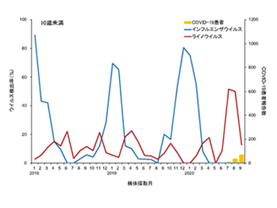 2,244人の検体のうち、最も多く検出されたのはインフルエンザウイルス(592人)で、次いでライノウイルス(155人)だった。475人からはその他の呼吸器感染症ウイルスが検出された。インフルエンザウイルスによって引き起こされるインフルエンザは主に冬に流行し、ライノウイルスによって引き起こされる風邪は主に春と秋に流行する。横浜市では2020年2月に初めてCOVID-19患者が報告され、10歳以上ではその後、報告数が増加していったが、10歳未満ではほとんど報告がなかった。一方、ライノウイルスの検出率は、COVID-19の流行下では10歳未満の小児で著しく上昇し、例年の2倍以上となった。インフルエンザウイルスやその他の呼吸器感染症ウイルスの検出率は、全年齢層でCOVID-19流行後に低下した。