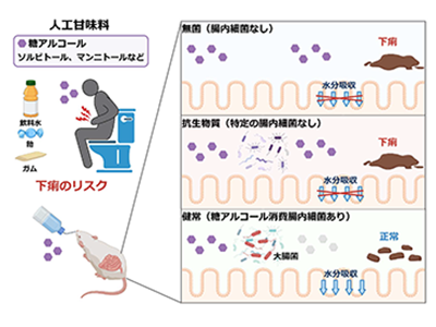 ソルビトールをはじめとする糖アルコールは、低カロリーの人工甘味料としてあめ、ガム、飲料などに幅広く利用されている。その一方で、糖アルコールの過剰摂取によって軟便や、体重減少を伴うような重度の下痢が引き起こされることも知られている。その要因として、難吸収性の糖アルコールが、腸管内の浸透圧を増加させ、水の再吸収を妨げることで下痢を発症すると考えられている。この糖アルコールによる下痢の起こりやすさには個人差があるが、その理由は明らかにされていない。今回研究グループは、この感受性を規定する因子の一つが腸内細菌ではないかという仮説のもと、研究を開始した。