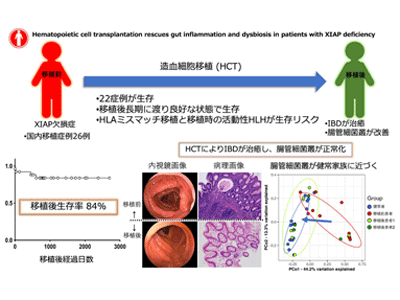 XIAP欠損症に対するHCTは、国際的な研究では望ましい成績が得られていなかった。しかし今回の研究で、日本におけるXIAP欠損症に対するHCTの成績が優れていることが明らかになった。また、XIAP欠損症に合併したIBDがHCTにより完治することが、多数の症例で初めて示された。さらにXIAP欠損症関連IBDでは、腸内細菌叢の異常が発症や治療抵抗性に関与している可能性が示され、この異常がHCTで改善することが明らかになった。今回の研究成果について、研究グループは、「XIAP欠損症のみならず先天性免疫異常症に合併したIBDの病態解明や新規治療方法の開発に大きく貢献することが期待される」と、述べている。