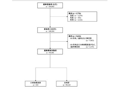 エコチル調査に登録された妊婦から生まれた10万4,062人の子どものうち、流産、死産、協力取りやめなどにより対象とならなかった者を除いた9万486人が本調査の対象となった。このうち、343人が1歳までに川崎病を発症した。9万486人の対象者について、川崎病発症の有無と母親の妊娠中の甲状腺疾患や糖尿病などの既往歴、妊娠後期の栄養状態や食事内容、妊娠中の葉酸・亜鉛などの摂取状況、母親の喫煙歴、両親のアレルギー疾患や川崎病の既往歴、出産方法(帝王切開など)、出産週数、生まれた子どもの新生児黄疸や兄弟・姉妹の有無などさまざまな因子についての関係を解析した。