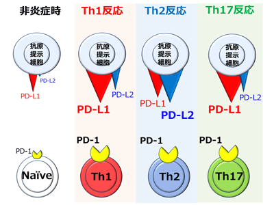 これらの結果により、Th1もしくはTh17反応はPD-L1によって制御されており、Th2反応はPD-L2によって制御されていることが明らかになった。一般に、PD-L1は樹状細胞などの抗原提示細胞を含む免疫担当細胞のみならず、組織構成細胞など非血球系細胞にも広く発現しているが、PD-L2は抗原提示細胞に発現が限局されていながらも、PD-1への結合性はPD-L1より強いという特徴がある。つまり、Th2反応では、PD-L2が発現してPD-L1発現が相対的に弱くなった環境下で、PD-L2がPD-1と結合して反応を制御するが、Th1反応とTh17反応では、PD-L1とPD-1との結合が主体となって反応を制御していることがわかった。