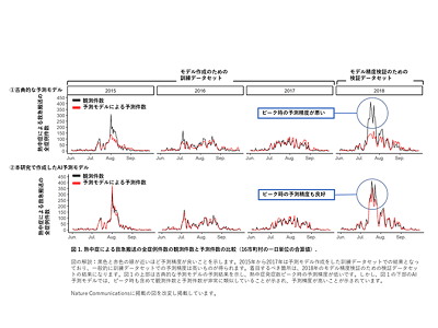 今回の研究で開発された、天気情報と暦情報と市町村の統計情報を用いた熱中症発症数予測モデルは、熱中症による救急搬送の全症例件数と中等症以上症例件数(入院診療、長期入院、死亡例)を高精度に予測することに成功した。気象条件と熱中症発症数が関連することは、すでに多くの論文で報告されているが、同研究のように熱中症発症数・重症度・発症数ピークを高精度に予測するAIモデルは世界初の研究結果であるという。