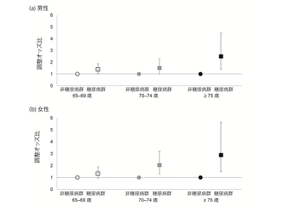 年齢の増加とともに、糖尿病群と非糖尿病群ともにクレアチニン値は増加していたが、糖尿病群は非糖尿病群より、男女とも低いクレアチニン値(低い筋肉量)が観測された。また、早期高齢者(65~69歳)、中期高齢者(70~74歳)、後期高齢者(75歳以上)の群で、それぞれ糖尿病患者および非糖尿病患者におけるクレアチニン低値(25%tile以下、男性:61.9μmol/l、女性:53.0μmol/l)になる確率を見てみると、どの年齢群でも非糖尿病群と比較して糖尿病群で有意に低クレアチニン値になる確率が高いことが観測された。またその関係性は各年齢群で異なり、特に、後期高齢者でより観測された。