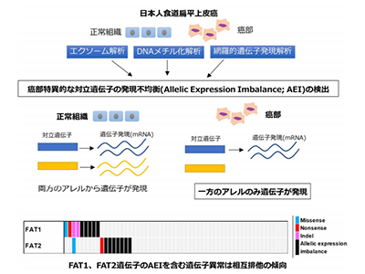 また、東京医科歯科大学医学部附属病院の67例においてDNAメチル化解析を、56例において網羅的遺伝子発現解析を実施。全エクソン解析結果も含めて統合解析を行った結果、1,567の遺伝子において、がんで特異的に対立遺伝子の発現不均衡(Allelic Expression Imbalance:AEI)が生じていることを見出した。