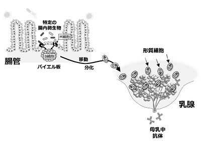 今回研究グループは、哺育中の母体の免疫系がパイエル板に存在する一部のB細胞に対して乳腺への移動を指示していること、また、その過程で、B細胞から形質細胞への分化が促され、乳腺に到着後の形質細胞から母乳中の抗体が産生されていることを明らかにした。加えて、母乳中の抗体が産生される際にパイエル板の免疫機能が高められるためには、腸管内に生息する特定の腸内微生物(B. acidifaciens、P. buccalisなど)の存在が重要であることを突き止めた。