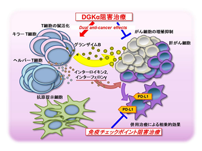 今回の研究により、肝がんに対するDGKα阻害剤による新規治療薬の開発の可能性だけではなく、がん細胞の免疫抑制をブロックする免疫チェックポイント阻害剤治療との併用により相乗的な効果を示すことから、肝がん治療における有望な治療戦略が示唆された。より多くの肝がん患者の救済につながると考えている、と研究グループは述べている。