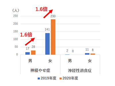 国立成育医療研究センターは10月21日、新型コロナウイルス感染症流行下の子どもの心の実態調査を行い、コロナ流行前の2019年度と比較し、2020年度では神経性食欲不振(神経性やせ症)の初診外来患者数が約1.6倍、新入院者数が約1.4倍に増加していたことが判明したと発表した。調査は、2021年4月30日~6月30日に同センターの子どもの心の診療ネットワーク事業が実施したもので、全国26の医療機関にアンケートを送付し、20歳未満の患者について回答を得た。