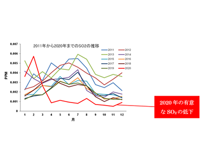 緊急事態宣言発令後、2020年神戸市の大気汚染物質は例年より明らかに少なくなり、SO2も有意に低下していた。2020年の春に喘息患者数のピークを認めなかったことは、SO2の低下や緊急事態宣言による社会的隔離による人的交流の減少、手洗いやマスクをつけることによる衛生環境の改善による影響と考えられ、2020年の秋のピークの再現は子どもたちの交流増加による感染症の罹患や、社会活動の増加に伴う環境汚染物質の増加、およびそれらへの暴露機会の増加の可能性が考えられる。