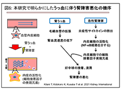 うっ血腎に対して、一過性の血流遮断(虚血再灌流モデル)によるごく軽度の傷害を加えただけでも、腎臓の顕著な障害が出現した。その傷害された腎臓では毛細血管の中に大量の白血球が充満していた。生体内イメージングでは、うっ血した腎臓に傷害を加えた際に白血球が血管内に接着し、血管外へ遊走していく様子が観察された。また傷害を与えた7日後には、うっ血腎では高度に線維化を来たしていた。このことから、うっ血は腎臓での傷害を悪化させること、傷害後の組織の修復を妨げることが明らかになった。