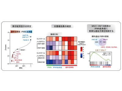 研究グループは、さらに詳細にデータを解析することで、このエピゲノム異常の責任分子としてMNX1とHNF1Bという消化器臓器の発生に重要な転写因子が協調して関与している可能性を見出した。これら転写因子に対するノックダウン実験やCRISPR干渉実験などの遺伝子操作を行うことでMNX1やHNF1Bを治療標的とすると、実際にIPMNやIPMN由来のがんに顕著な腫瘍抑制効果を示すこと、IPMN由来がん特有のエピゲノム制御や代表的遺伝子発現に寄与していることなどの重要性が確認された。
