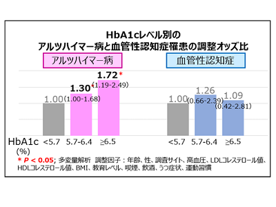 その結果、糖尿病診断、HbA1c高値、GA高値はアルツハイマー病罹患と有意に関連していることがわかった。特に、HbA1c 5.7~6.4%の境界型糖尿病では、正常型(HbA1c 5.7%未満)と比べて、アルツハイマー病罹患のリスクが1.30倍(オッズ比)に増加していることも明らかになった。