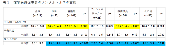 これらのことから、COVID-19の流行拡大が在宅医療従事者のメンタルヘルスに与える影響は、医師よりも看護師、ソーシャルワーカー、事務職員の方が顕著であり、職種に合わせたメンタルサポートや支援が必要であることが示唆された。