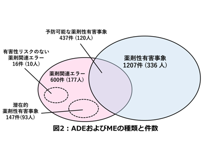 調査の結果、ADEは全対象者の73%にあたる336人に対して1,207件、MEは全対象者の39%にあたる177人に対して600件同定され、その発生率(incidence)は100人月あたりそれぞれ36.4件(95%信頼区間:34.4-38.5)と18.1件(95%信頼区間:16.7-19.5)だった。また予防可能なADE(MEを伴うADE)と潜在的なADE(ADEにつながった可能性のあるME)の発生率は、100人月あたりそれぞれ13.2人(95%信頼区間:11.9-14.4)と4.4人(95%信頼区間:3.2-5.7)であり、ADE全体の3分の1は、予防可能なADEだった。
