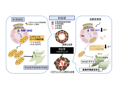 エポキシ化オメガ3脂肪酸の産生酵素であるPAF-AH2は、炎症細胞の一つである肥満細胞に強く発現していることが知られている。そこで、このPAF-AH2とエポキシ化オメガ3脂肪酸に注目し、肺高血圧症の病態との関連について研究を行なったところ、肥満細胞のPAF-AH2によって産生されるエポキシ化オメガ3脂肪酸が、肺血管の線維化を抑制し、肺高血圧症の発症・進行を抑えていること、また、PAF-AH2が低下あるいは欠失した場合、肺高血圧症の重症化を招くことを明らかにした。さらに、エポキシ化オメガ3脂肪酸の投与は、TGF-βシグナルを介した肺線維芽細胞の活性化を抑えることで、肺血管の病的な組織変化および右心不全の改善をもたらした。その効果は、複数の肺高血圧症の動物モデルにおいても実証され、治療薬としてのポテンシャルが確認された。