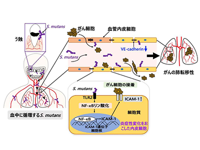 近年、口腔細菌と全身疾患の関わりが報告されるようになってきた。例えば、口腔内細菌が抜歯などの外科治療や歯周炎の病巣から血液循環に侵入し、さまざまな炎症性変化を全身に引き起こすことが明らかになっている。口腔細菌の中でもミュータンス菌は、う蝕の原因として最も有名な菌の一つ。近年のin vitro実験では、ミュータンス菌が血管炎症を起こすことが報告されていた。一方、血管の炎症は血管の透過性亢進をもたらし、血行性転移につながることが知られるようになってきた。しかし、口腔内細菌によるがんの転移への関与については不明だった。