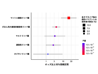 研究ではまず、独自に開発したゲノム解析手法を用いて、バイオバンク・ジャパンにより収集された悪性リンパ腫患者群2,066人の血液から抽出したDNAを解析した。非がん対照群38,153人のデータも併せて、乳がん、前立腺がん、膵がんなどの発症に関連する27個の遺伝性腫瘍関連遺伝子について評価した。その結果、4,850個の遺伝子バリアントが同定され、そのうちの309個が病的バリアントであると判定された。これらの病的バリアントと悪性リンパ腫の発症リスクの関連解析を実施したところ、4個の遺伝子(BRCA1、BRCA2、ATM、TP53)が悪性リンパ腫の発症リスクに関連することが判明した。悪性リンパ腫患者のうち、1.6%がこれらの遺伝子に病的バリアントを保持していた。各遺伝子における病的バリアントの悪性リンパ腫の発症リスク(オッズ比)は、最も関連が強かったBRCA1の場合、対照群と比較して病的バリアント保持者は悪性リンパ腫の発症リスクが5.88倍高かった。